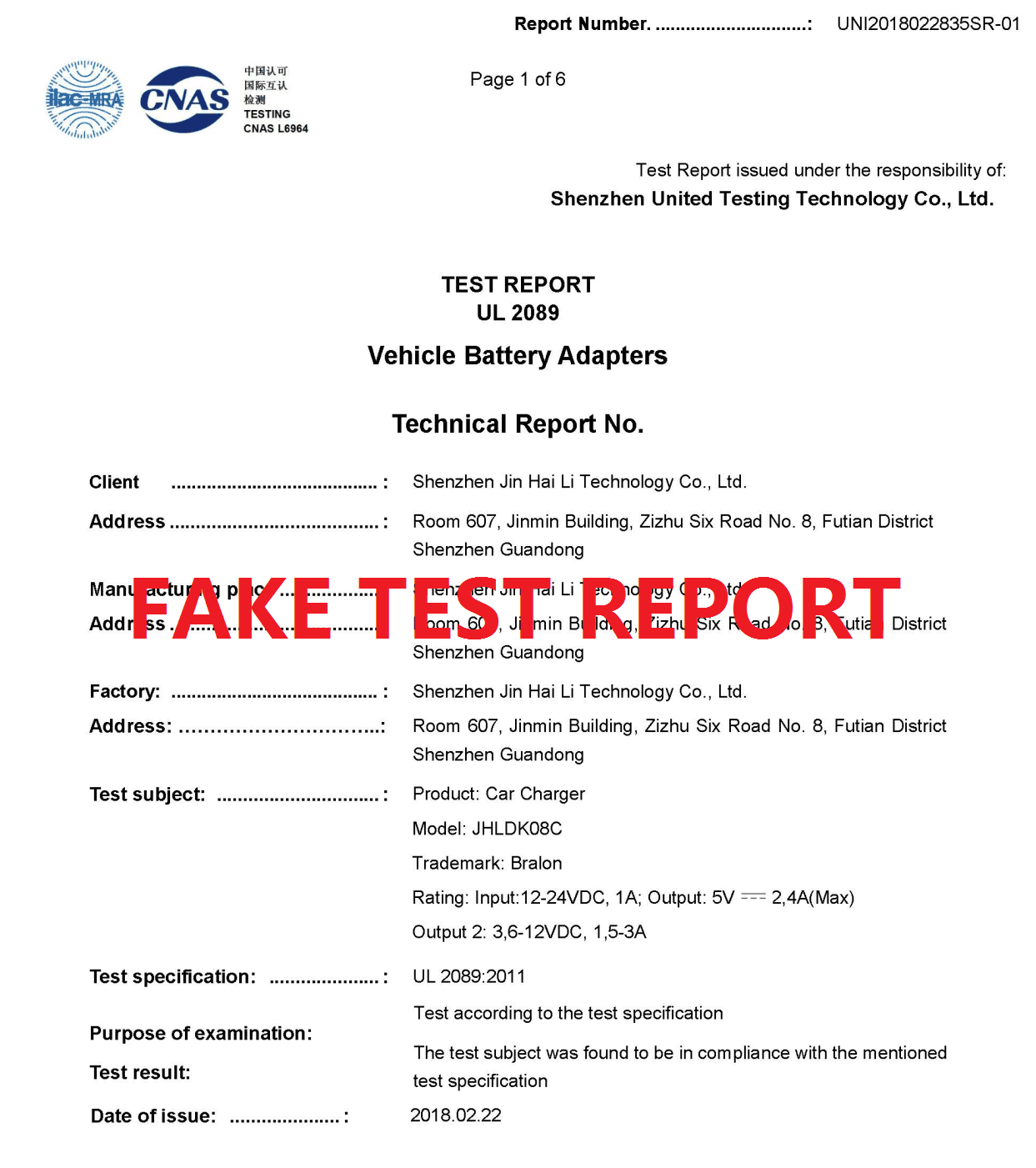 驗室嚴格遵守ISO17025體系要求,UL相關標準不在我實驗室認可資質范圍內,我實驗室從未出具任何UL標準的測試報告。請廣大客戶和各機構留意,不要受騙。 深圳市優耐檢測技術有限公司2018年3月15日